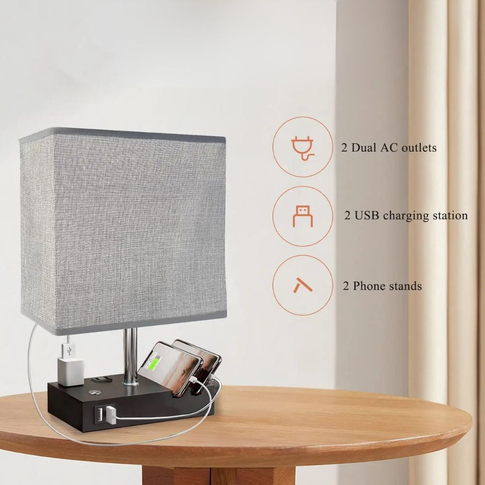 Equipped with dual USB-B charging ports, 2-prong outlets, and 3-prong outlets, this nightstand lamp allows you to charge multiple devices at once—even when the lamp is OFF. No more searching for wall sockets or unplugging your essentials. The smart phone stand slots integrated into the base keep your devices upright and organized while charging.